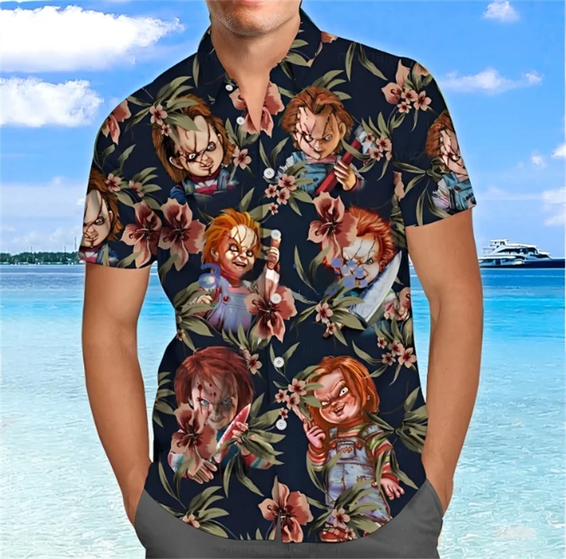 남녀공용 3D 프린트 셔츠, 반팔 라펠 카미사스 Y 블루사스 하와이안 셔츠, 남성 상의, 공포 영화, 처키의 신부